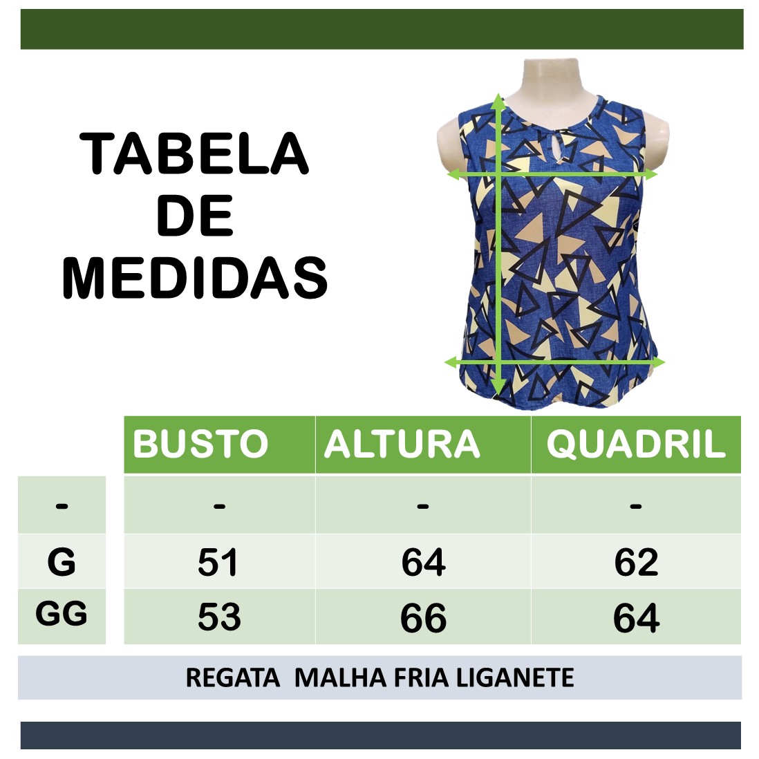 Tamanho: GG | Largura Busto: 53cm | Comprimento: 67cm | Quadril 64